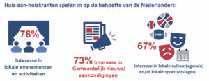 - 76% van de lezers is geïnteresseerd in lokale evenementen en activiteiten, 73% in gemeentelijk nieuws en aankondigingen en 67% in lokale cultuur(agenda) en/of lokale sport(uitslagen)